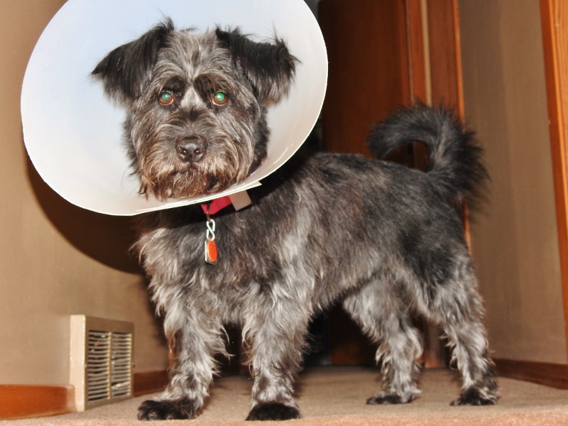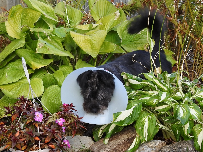 A cone on her head sure didn’t stop Macy from sniffing everywhere.