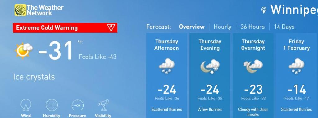 Currently the temperature here is a balmy -30C with a windchill of -42C and after the last few days, that is almost comfortable, although the extreme cold warning is still posted. This afternoon, they predict it will be -24C with a windchill value of -36C. Tomorrow they say it will be -14C with a windchill of just -17C.