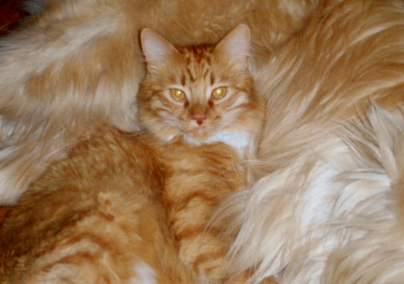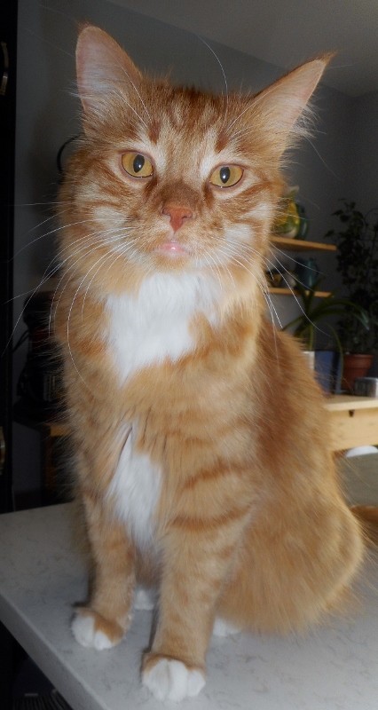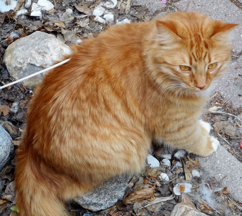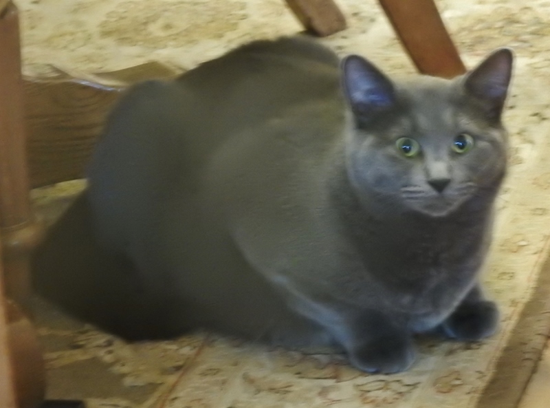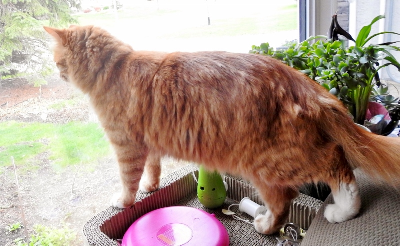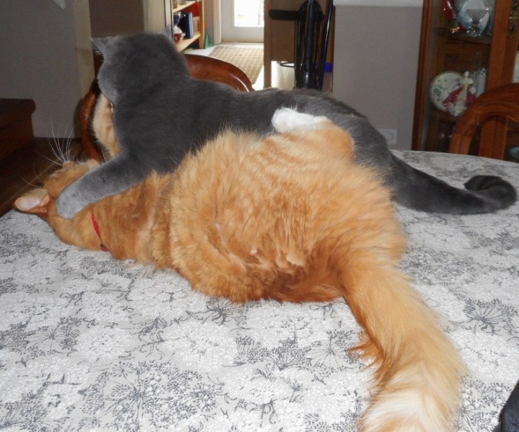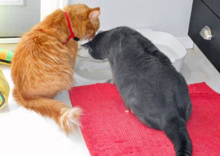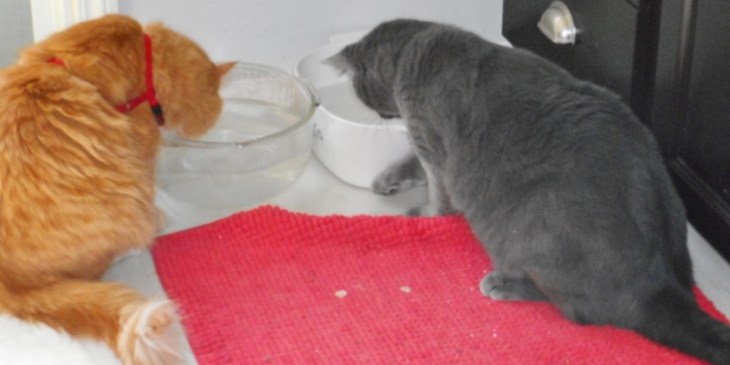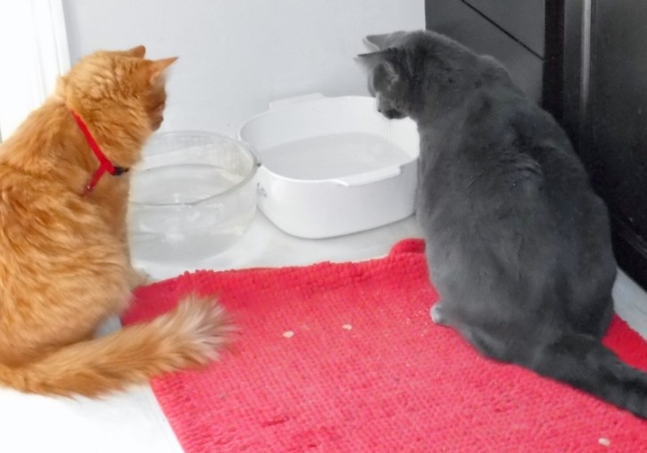 And then the cats again. First, checking out the ice cubes I put in the water dish and ending with some play fighting on the table.