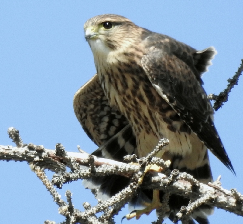 Some birds managed to get into part of my day, when I was told about some that roosted in a nearby tree and were killing birds at neighbourhood feeders. So, I watched the tree and got some photos, and was able to identify them by posting on the Facebook group Manitoba Birds, Birding and Photography. So – these are Merlins. There are 4 of them, but I only managed to get a photo of 3 of them. I did see the 4th one when I didn’t have my camera with me.