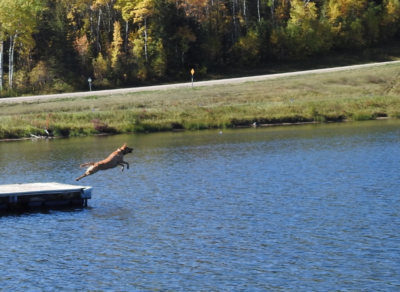 Highway # 19 comes to an end at Highway #10, which goes the full length of the park and when I reached #10, I turned to head for the Wishing Well road. I stopped to look around & found a couple of people with their dog Layla and I soon found out that Layla is a water dog. My Dakota was the only water dog I’ve ever had, so it was fun watching Layla in and out and fetching her toy from the water. I took some photos of her. 🙂