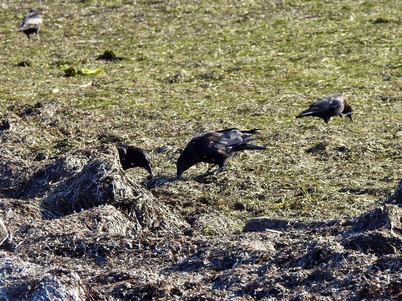 The crows are in the seaweed and stuff washed up on the shore after the tide has gone out. There must be a bunch of yummy things in there to eat.