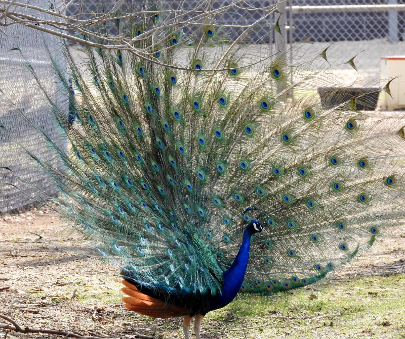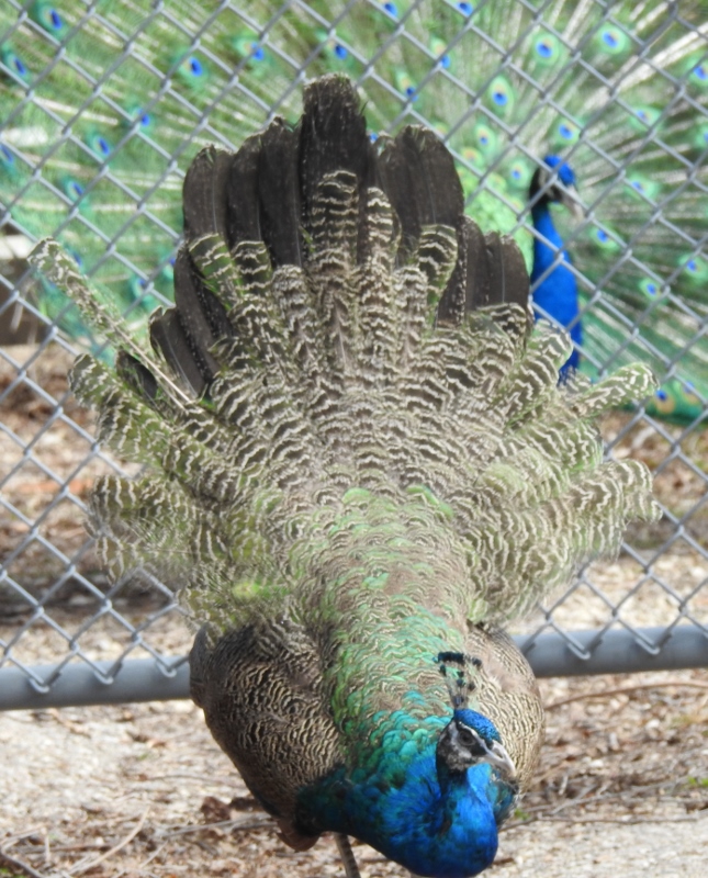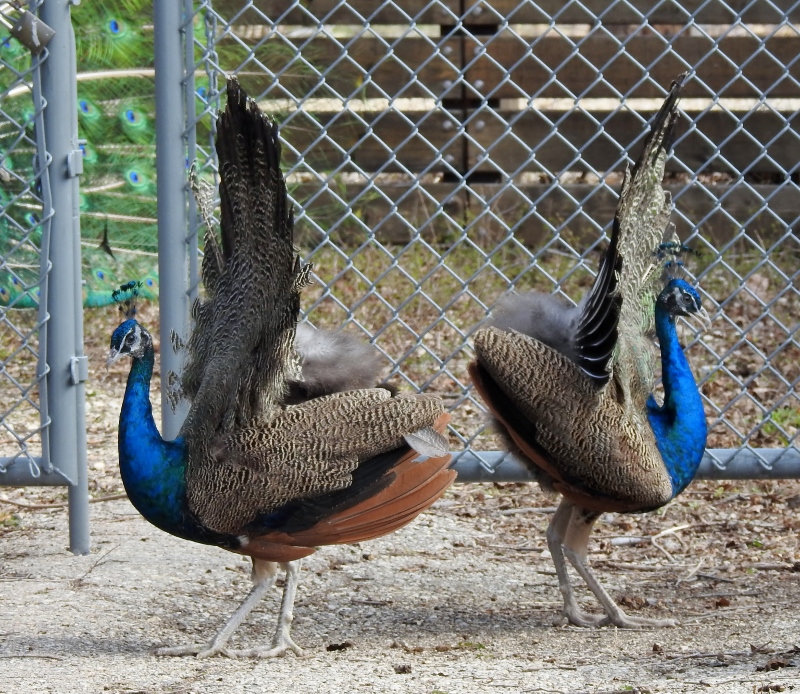 Peacocks – with a young male attempting to show his tail also