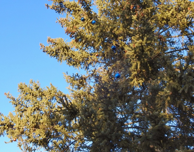 Decorations on a tree. The blue ones are tied together & must have been thrown up since they are too high to reach without a ladder