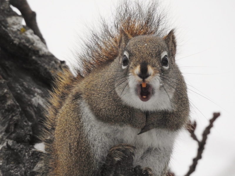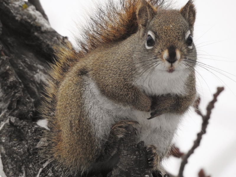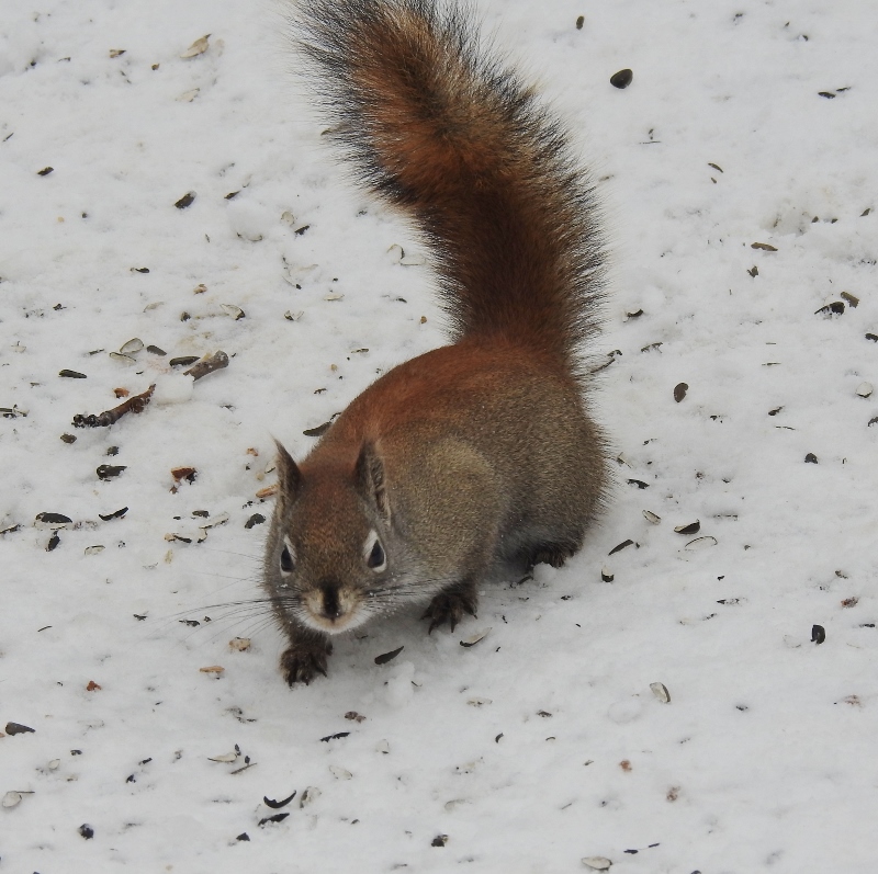 Red Squirrel hanging out under the bird feeder looking for a snack