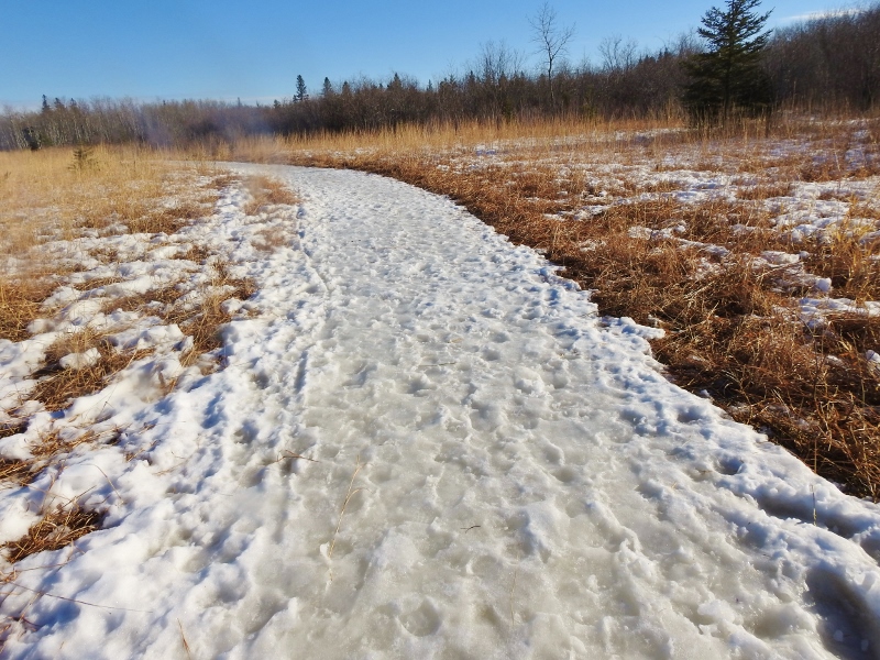 First I stopped at the Prairie Winds trail for a walk. Due to melting and re-freezing over the last couple of weeks, the trail wasn’t in great condition, but was walk-able (with the spikes on my shoes). The shady spots on the trail were mostly frozen, but in the open parts, it was softer.