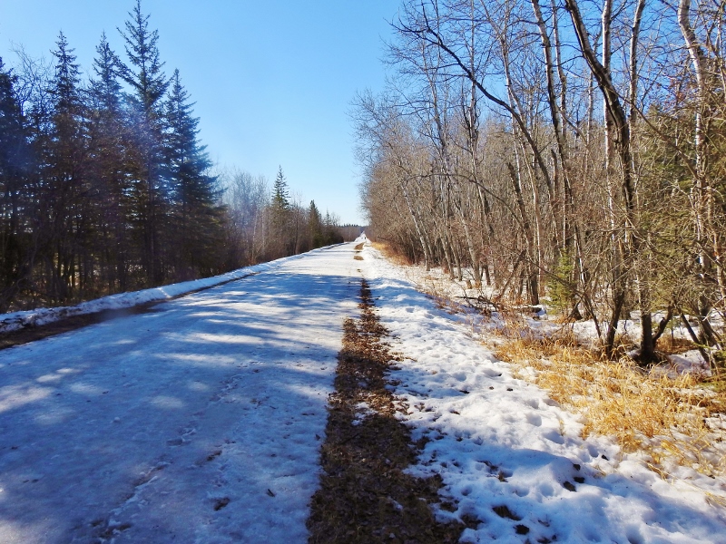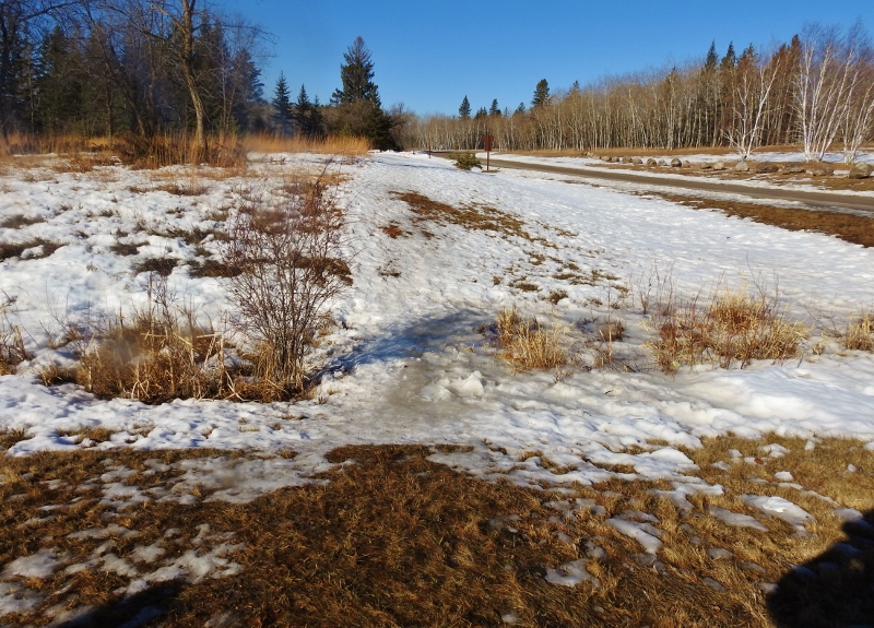 I did the entire walk to the end of the road, where it joins onto the large circle and comes back to this road. I couldn’t find where I got onto the circle after being lost though. So much snow has melted that nothing looked familiar. I did have a great walk and the road was fine to walk all the way back without worrying abut slipping. I also did find a couple of Chickadees – but they were obviously not the same ones who followed me in the campgrounds since they would not come to my hands – even with yummy seeds.