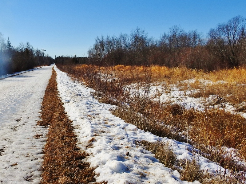 I am walking on the side of the road on that strip of grass between the icy road and the snowbanks into the ditch. This part of the road was very icy most of the time, but many spots were great for walking. I was wearing spikes on my shoes, but they don’t dig into solid ice although they worked just fine if the ice had a little softness in it.