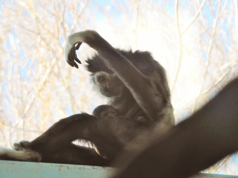 White-handed Gibbon Maya with her new baby – just visible under Maya’s head.