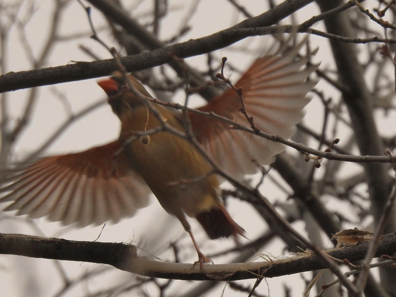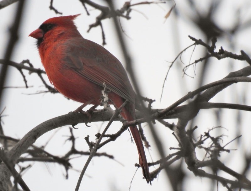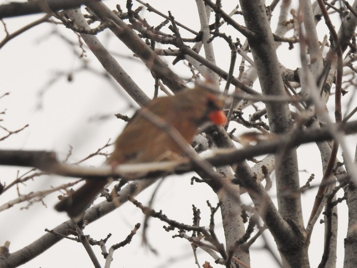 A few months ago, I met a woman who showed me the area where she normally sees them – but none were around there that day or any other day when I’ve been there. Just as I reached that area today, I met 2 women who asked me if I was looking for Cardinals. I think one of them was the same woman I talked to before, but the other one said follow me and she lead me a little further on. She pointed out one and I started snapping. This one was a male and then on another tree nearby, there was a female.