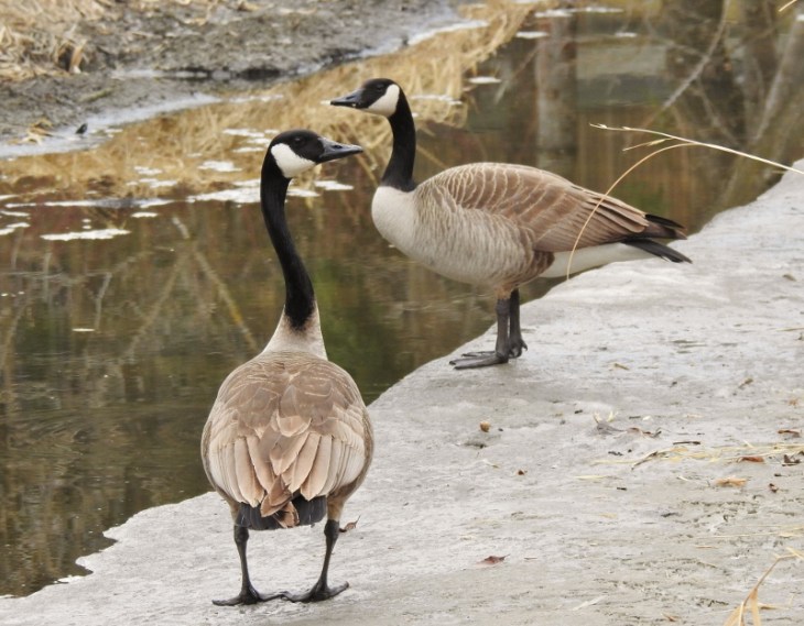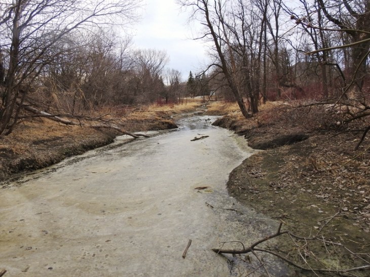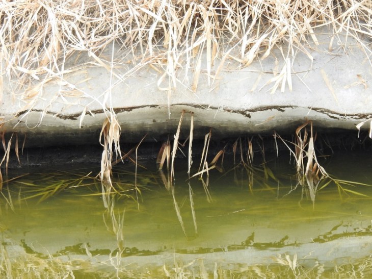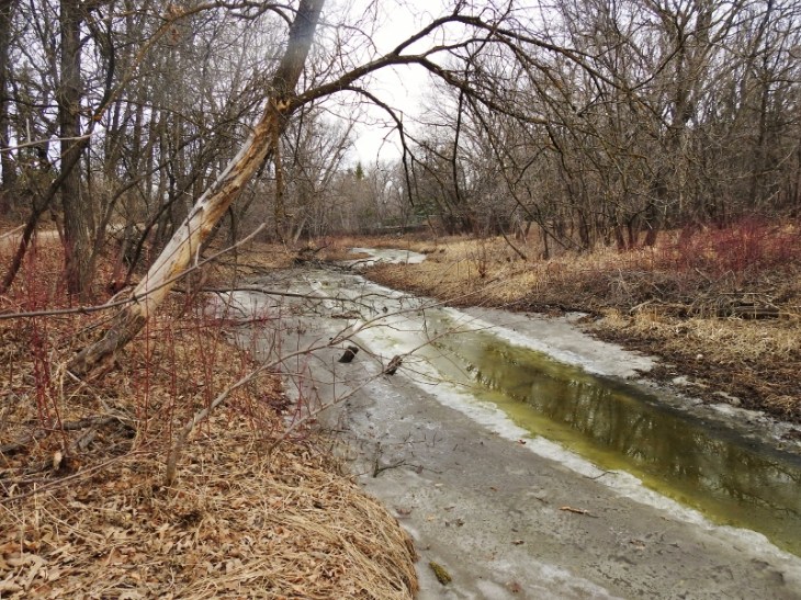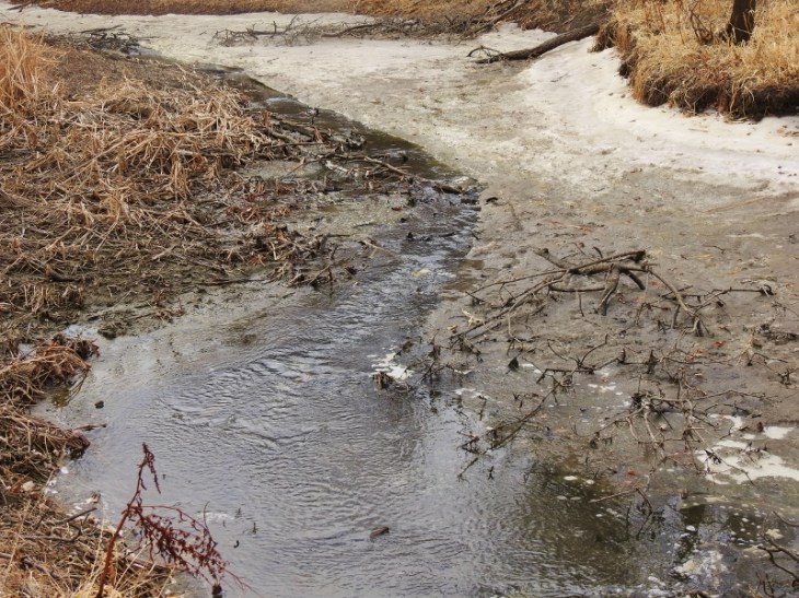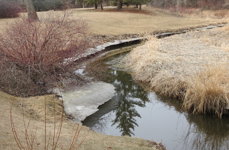 In the 2 photos above, I am trying to show the distance between the water and the ice, which shows how much the creek has dropped from when it iced up. In the first one you can see the grasses – but where they have the green background – they are underwater and that is the reflection from the grass above the water – and with the black background, they are above the water, but under the ice. So, this indicates that the water has dropped by about 8-10 inches (I didn’t measure). This is spring, when we usually have flooding – but it is very dry. We really need rain and lots of it in the next few weeks. The 2nd photo also shows the black under the ice and above the water.