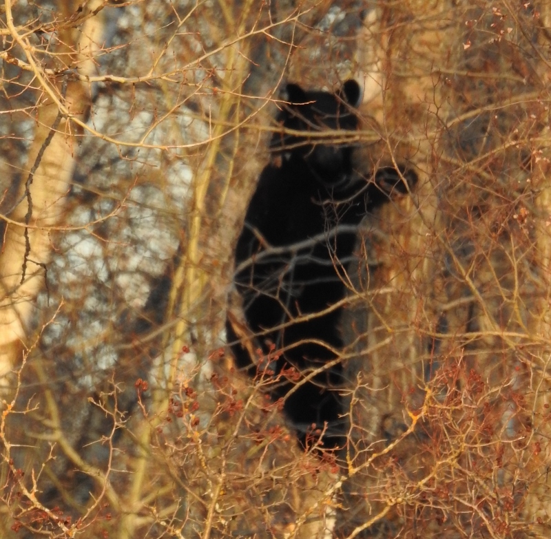 On my way out of the Bison enclosure, I saw some black things in a tree. I thought at first they were those big black garbage bags and I was so unhappy to think that someone had thrown those out. Then, when one of them moved, I realized that they were 4 Black Bears up in the tree. These photos were taken using a lot of zoom and have been cropped – but it was exciting to see them.