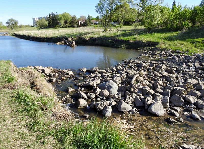 I wonder why there are rocks across the creek? You can see another pile in the distance and they seems to be approximately the same distance between them all along it on this side of Portage Avenue.