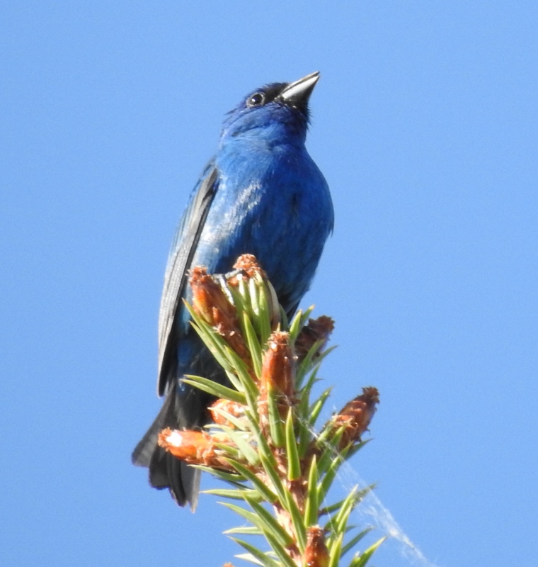There is another bird that spends the summer here in Manitoba that I have been hoping to get a photo of for awhile now. I have had quick glimpses of the male diving into a dense bush, but until yesterday, have never managed a photo. He nicely posed and sang a song at the top of an evergreen – so I finally got some photos of the beautiful male Indigo Bunting.