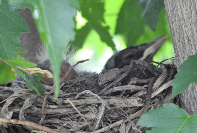 I didn’t have a lot of luck with the Robin’s nest. There are at least 3 babies in it, but shooting between the leaves & branches into a very shady spot was not easy. One photo is better than the rest though, so here it is.