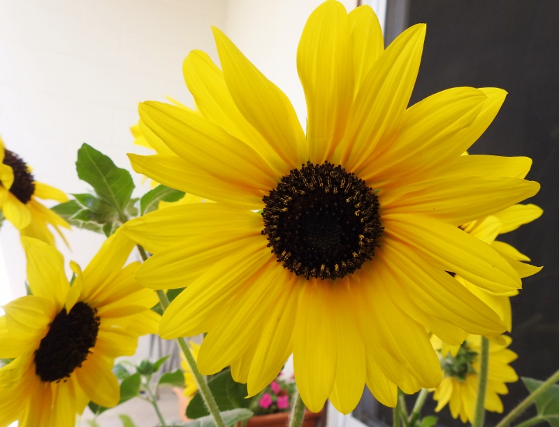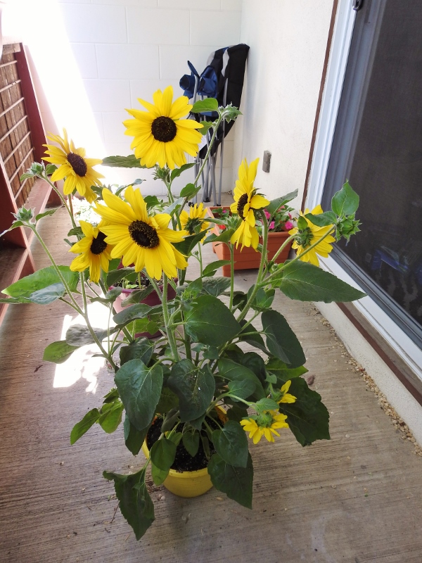 I don’t get a lot of sun on my balcony, so I hope they will be fine out there. Actually, just as I was getting ready to post this, I noticed that the sun has now reached my new sunflowers, so I grabbed a couple more photos.