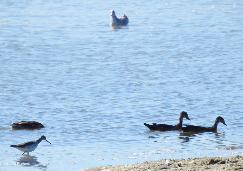 A gull, some ducks and a sandpiper (I think the ducks are Wood Ducks)