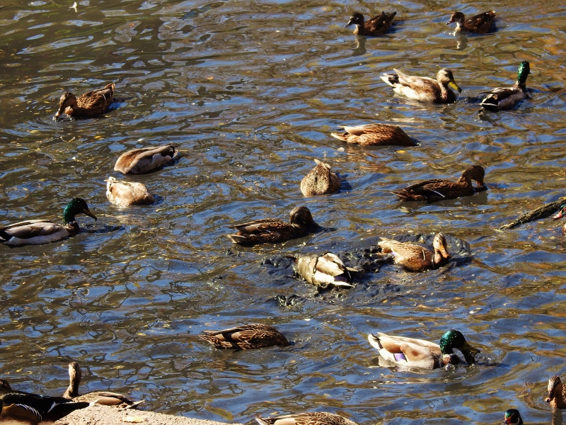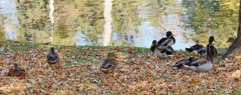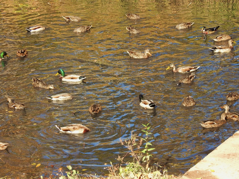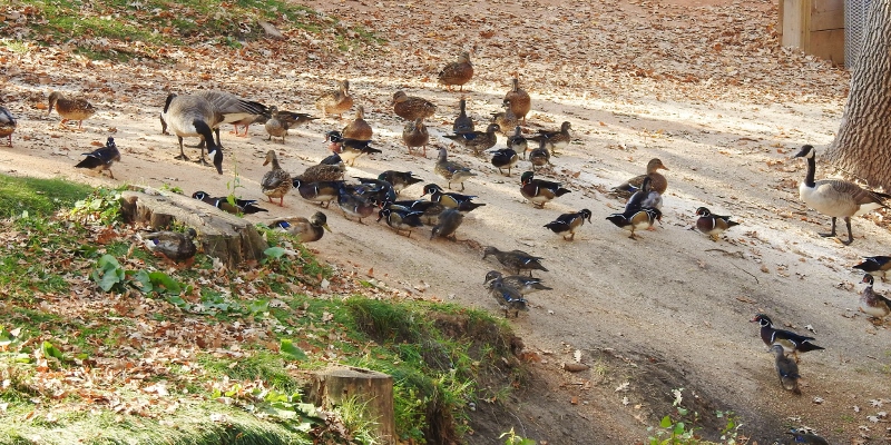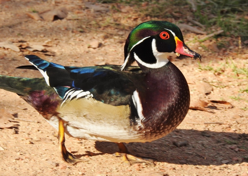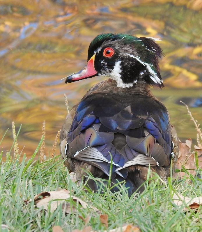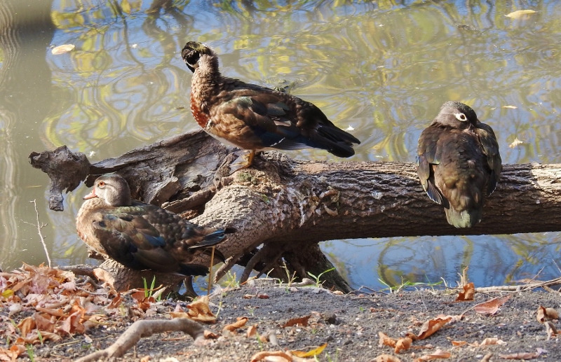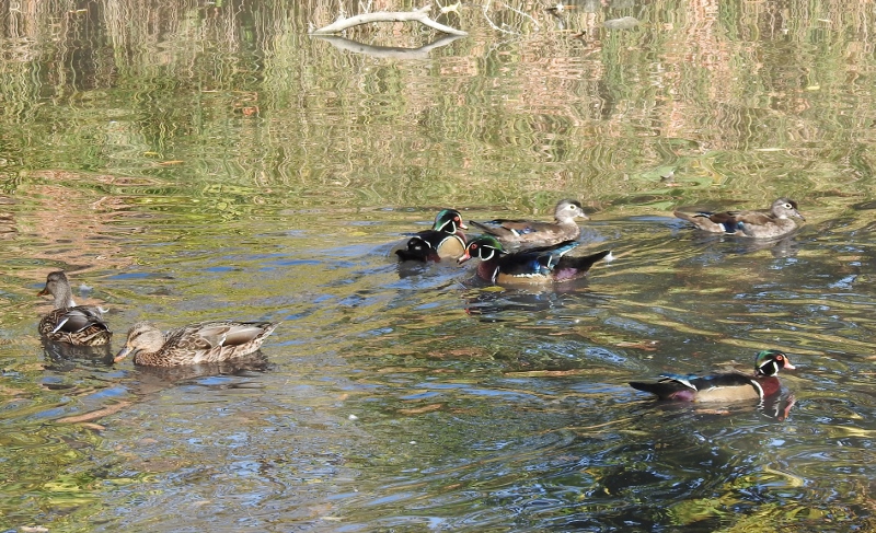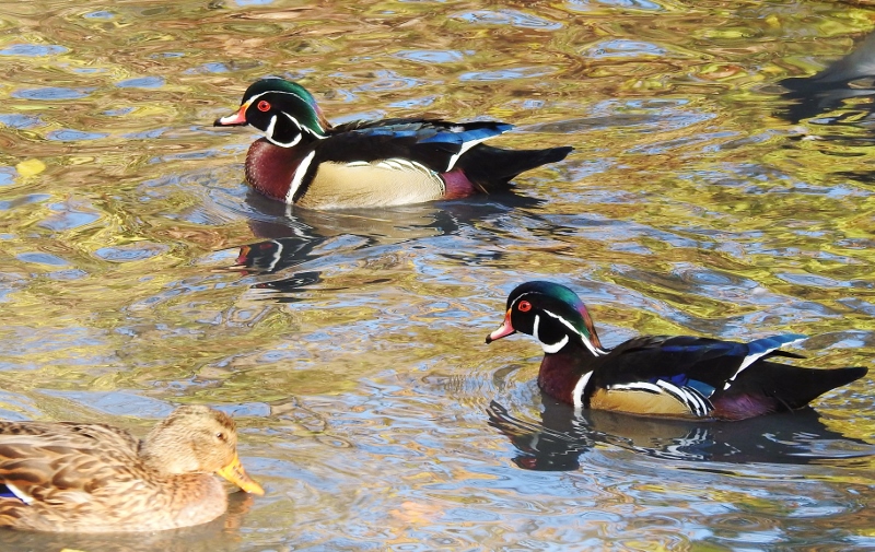 a couple of fancy male Wood Ducks and a female Mallard Duck