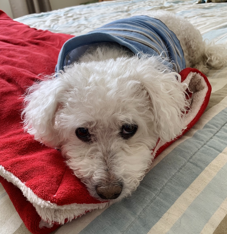 As you can see from the photos, Teddy is not wearing his cone now. By wearing this little t-shirt, he doesn’t try to get at the stitches and is much happier. This might not work with every dog, but it sure does with Teddy.
