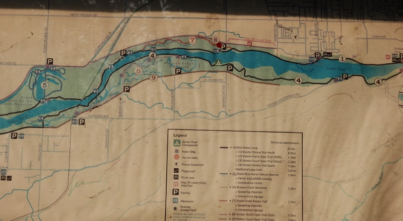 The Vedder Crossing Bridge is the bridge where I’ve taken photos of the river & the people fishing. Vedder Park is where I’ve parked my car the other trips. Peach Park is the 2nd parking lot along the trail and I have previously walked about 1/2 way from Peach Park towards the spot I have now parked this time. The red dot on the map is where I parked this time.
