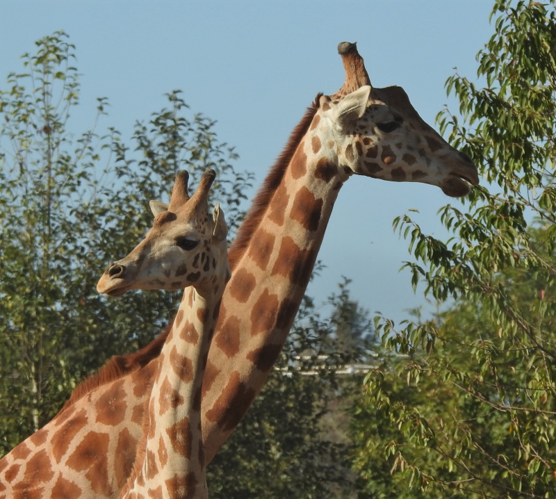 Two male Giraffes – maybe father & son. I can tell they are both males because the tops of their ossicones (look like horns) are bald. There is usually a 3rd Giraffe, but I only saw the 2 today.