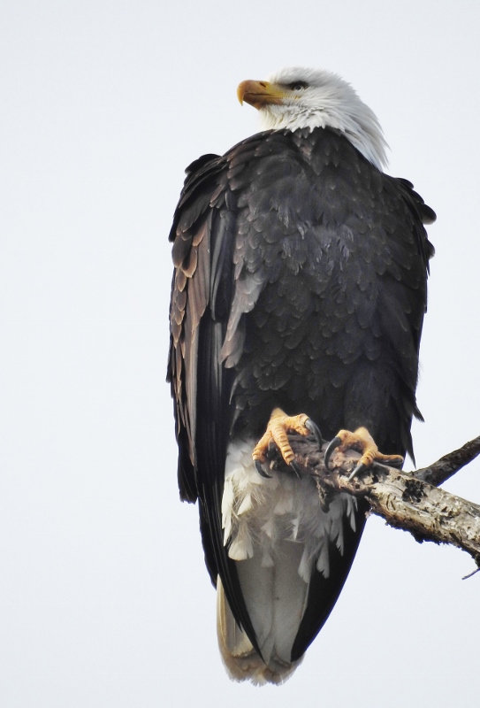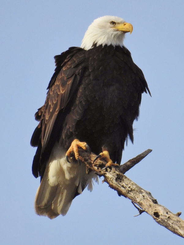 This gorgeous Bald Eagle was perched a long way up on top of a dead tree. The pair lost their nest last fall and I was walking around looking up to try to find where they are building a new one. I didn’t find it, but I did find this one perched in a spot where I’ve seen him (or her) before.