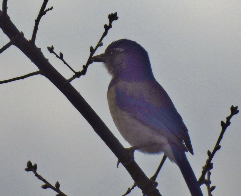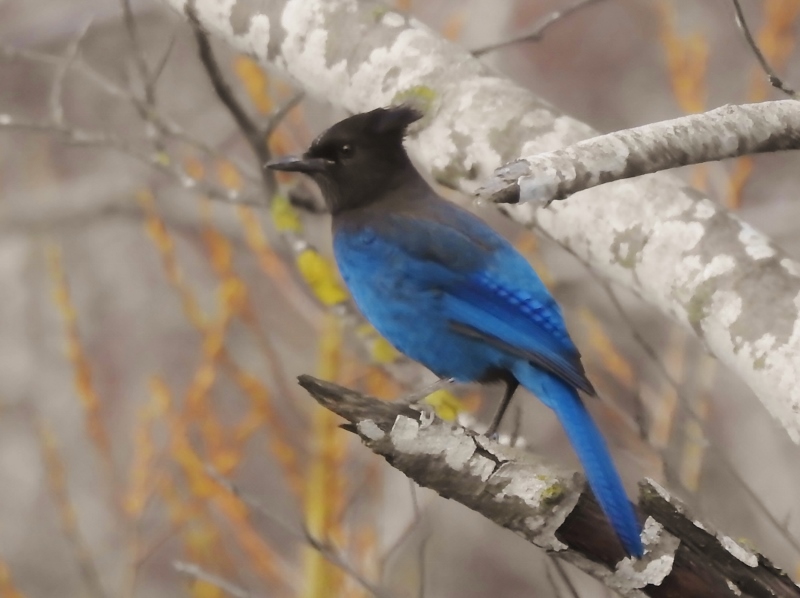 This is the first time I’ve ever seen a California Scrub Jay, and unfortunately, the sun was behind him and the colours are not right on him (or her). The Steller’s Jay was much more cooperative and perched on the other side of the dyke.