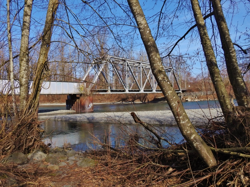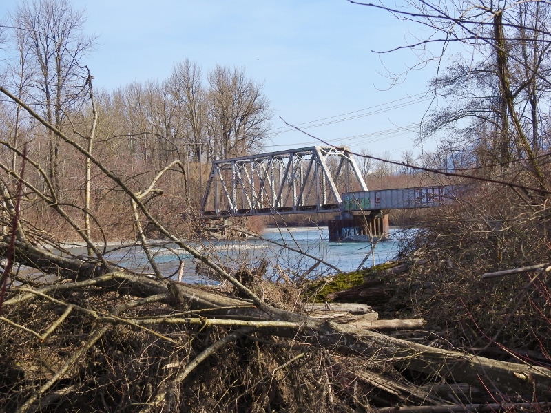 There is the bridge that I passed ages ago where the Great Blue Heron Reserve starts on the other side of the river. Then I had to take another photo of the bridge after I had passed under. There was a man walking on the tracks and I don’t know if he walked across the bridge or not. He was still standing on the tracks when I took the second photo of the bridge,