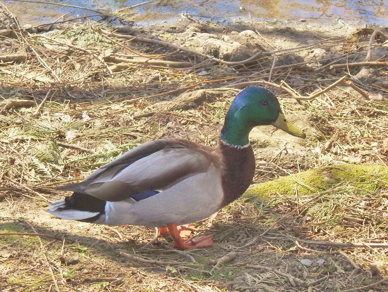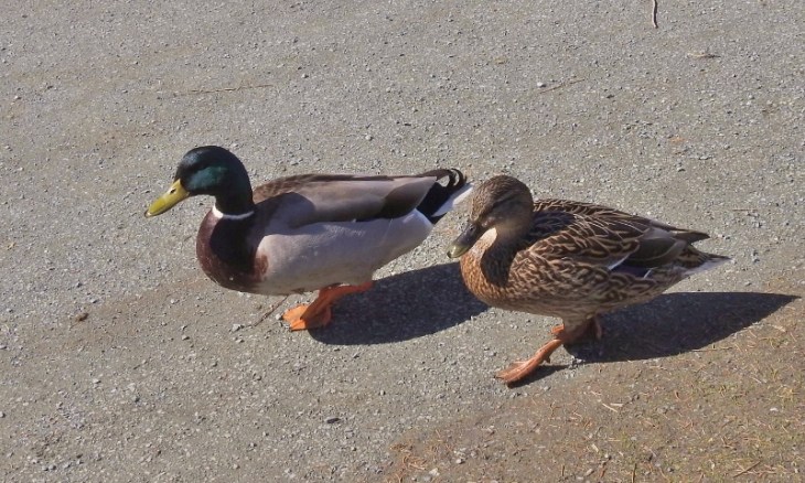 Three views of 3 male Mallard Ducks along with 1 female Mallard Duck