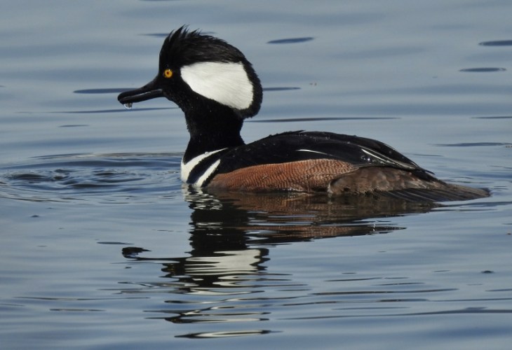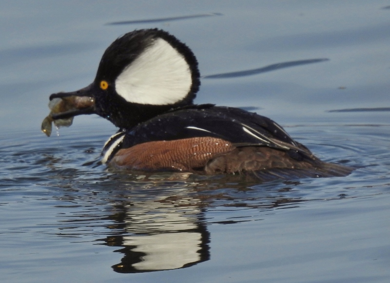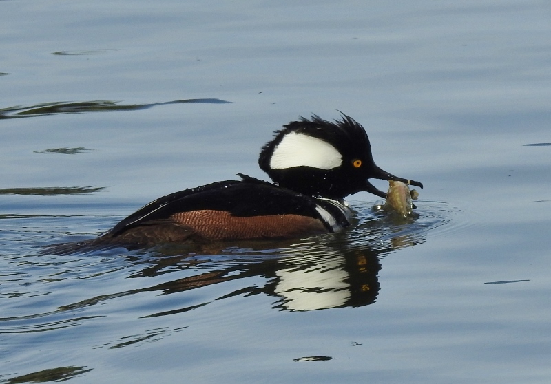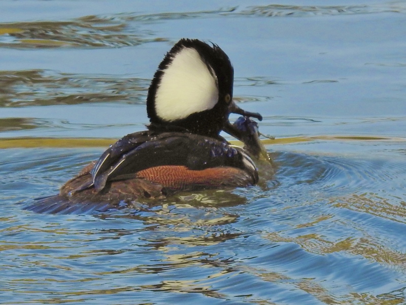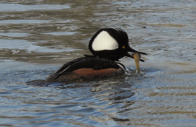 I was at the right place & the right time to get these photos of the Hooded Merganser & his meal. He dove under just as I was snapping a photo and I started snapping more as he surfaced. He caught a fish!