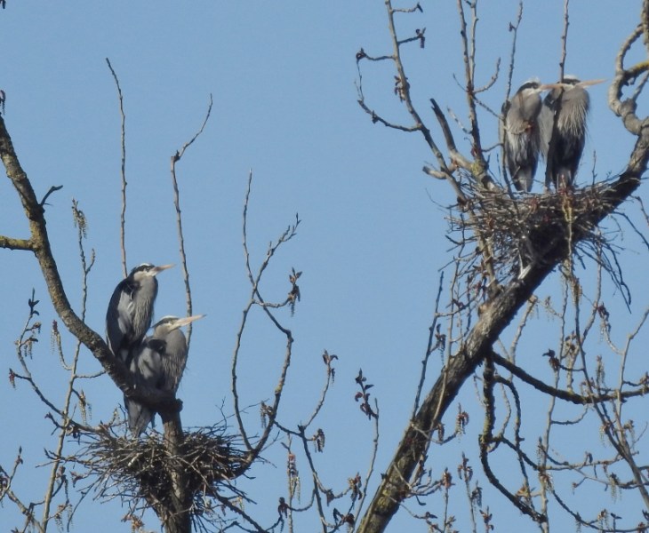Something that I’ve learned since being in B.C. is that the Herons like to nest close to a Bald Eagle nest. Bald Eagles eat Heron eggs & chicks, but the Bald Eagle nesting close to the Herons will not allow other flying predators from doing the same. The Eagles are defending their territory and preventing other hawks & eagles from being in their territory. So the result is that the Great Blue Herons will successfully raise most of the chicks due to the help from the Bald Eagle. If they didn’t have the security of the Bald Eagles protecting their territory, the heron population would drastically drop.
