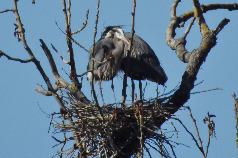 Something that I’ve learned since being in B.C. is that the Herons like to nest close to a Bald Eagle nest. Bald Eagles eat Heron eggs & chicks, but the Bald Eagle nesting close to the Herons will not allow other flying predators from doing the same. The Eagles are defending their territory and preventing other hawks & eagles from being in their territory. So the result is that the Great Blue Herons will successfully raise most of the chicks due to the help from the Bald Eagle. If they didn’t have the security of the Bald Eagles protecting their territory, the heron population would drastically drop.