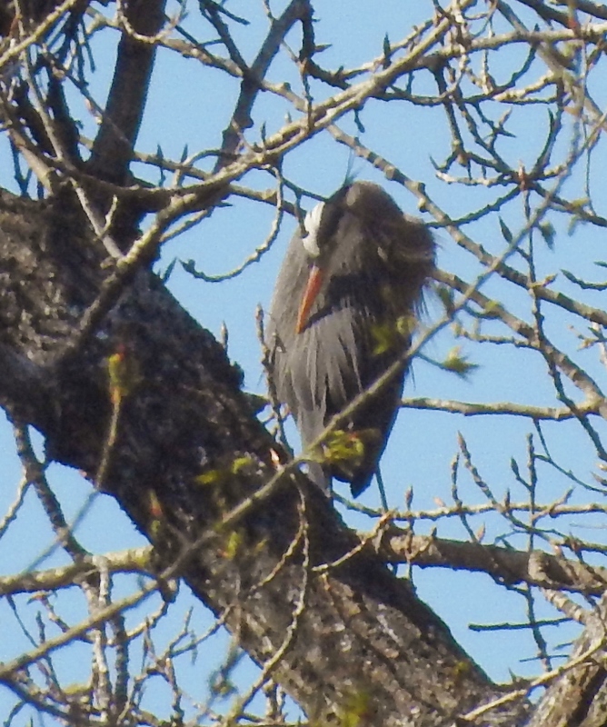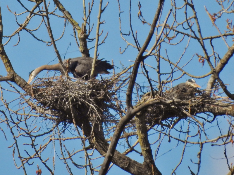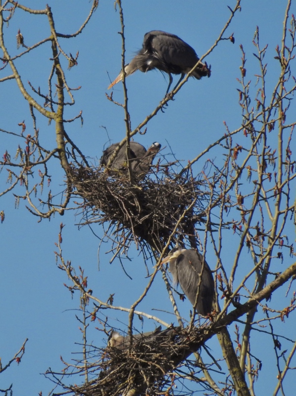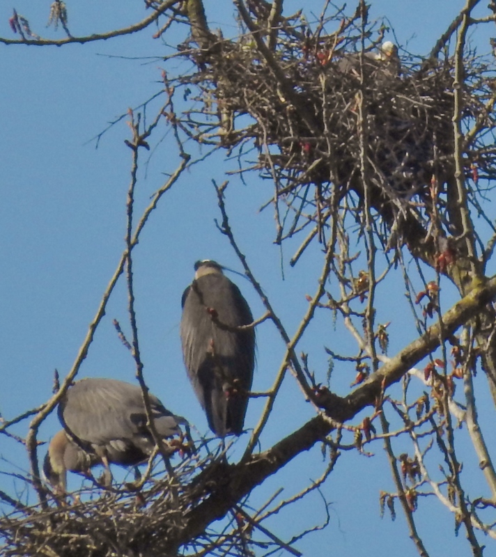 I don’t know if any of them have laid eggs yet or not. If they lay up to 5 eggs, they might not start to incubate until they have 3 or 4 eggs in the nest. So there may be some eggs in at least some of the nests already. I will be very excited to see my first Heron chicks.