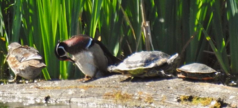 Perched on a log out in the water, were a pair of Wood Ducks and a couple of Turtles.