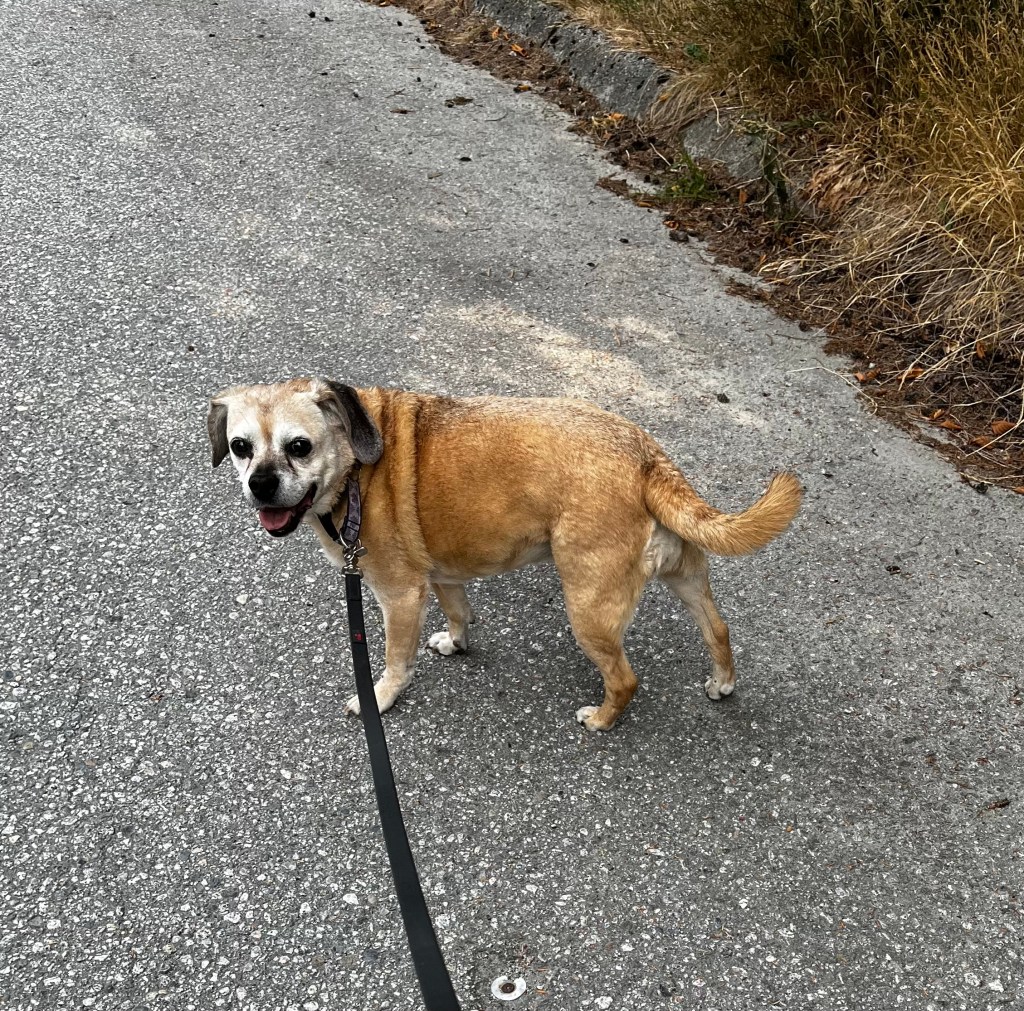 I put these 2 photos together to show Daisy’s change in attitude as we walked. The photo on the right is her “come on – lets keep moving look. Notice the difference in the tails. The 2nd photo was when she smelled something and was not happy.