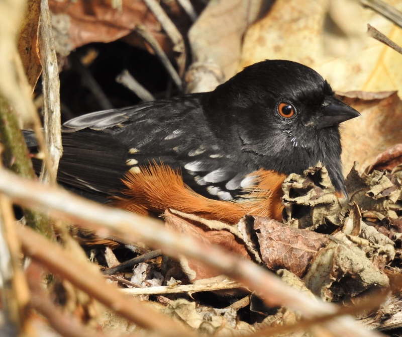 If you mean the bird with the black back, white spots on the wings & orange belly – that is a Spotted Towhee. It is a beautiful bird.